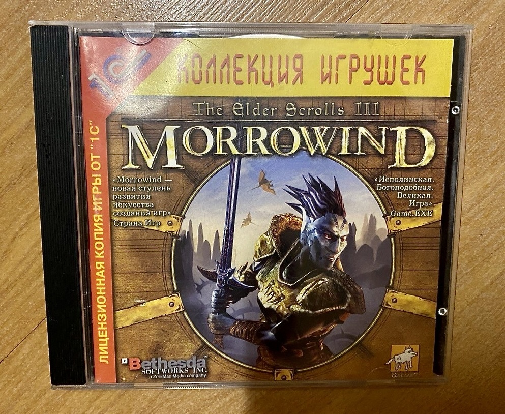 Нашёл в своих закромах вот такую легенду. Знаменитый джевел-бокс The Elder Scrolls III: Morrowind, который купил ещё в 2004 году. В общем, полностью согласен с рецензентами из Game.EXE и «Страны Игр» по поводу эпитетов на лицевой стороне диска. Морровинд для меня действительно великая и действительно новая ступень в ролевых играх. И я даже согласен с рисунком в центре, где изображён Нереварин с обнажённым клинком на фоне пустошей и скальных наездников. Со скальными наездниками вы действительно будете сражаться большую часть игры. Раскрываем коробку, а там... DVD-диск журнала PC-игры. Вот те раз. А где Морровинд? Уже не вспомню. Видимо, диск с игрой я оставил где-то в приводе компьютера, а сюда закинул диск из журнала, который не знал куда пристроить. Кстати, сам журнал у меня тоже есть, вот так выглядит его обложка, если что: Ладно, вернёмся к Morrowind. На раскрытой коробке, слева, мы видим список рекламируемых игр — я обожал эту колонку, ведь здесь я знакомился с новыми играми, о
