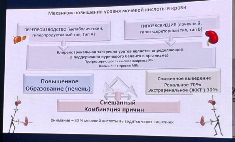 Инсайты ISSAM: мочевая кислота — маркер, который мы недооценивали Конгресс ISSAM завершился, но поток инсайтов нет. Сегодня говорим о показателе, который все видят в анализах, но почти никто не воспринимает его как маркёр биологического старения, воспаления и кардиометаболического риска — мочевой кислоте (МК). Главные открытия: 🔸 МК — не только про подагру. Даже её умеренное повышение связано с ускоренным старением сосудов и эндотелиальной дисфункцией. Хроническое низкоинтенсивное воспаление начинается задолго до симптомов. 🔸 30% мочевой кислоты выводится через ЖКТ. Поэтому состояние микробиоты напрямую влияет на пуриновый обмен. Некоторые бактерии способны расщеплять МК, другие — усиливать воспаление и повышать её уровень. Выбирая пищу, важно помнить: кормить нужно друзей, а не врагов. 🔸 Инсулинорезистентность полностью блокирует вывод МК. Отсюда связь гиперурикемии с метаболическим синдромом, МКБ, дислипидемией и доклиническим атеросклерозом. 🔸 Гиперурикемия бывает двух тип