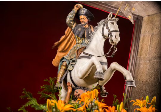 Параллельно с этим формировался и образ апостола Сантьяго как воина и защитника христианства. Его культ активно поддерживался искусством, литературой и архитектурой. В XII веке была основана Орден Сантьяго (Orden de Santiago), а папа римский официально признал налог в пользу собора. Всё это делало Сантьяго-де-Компостела не только религиозным, но и политическим центром, сопоставимым с Иерусалимом и Римом.