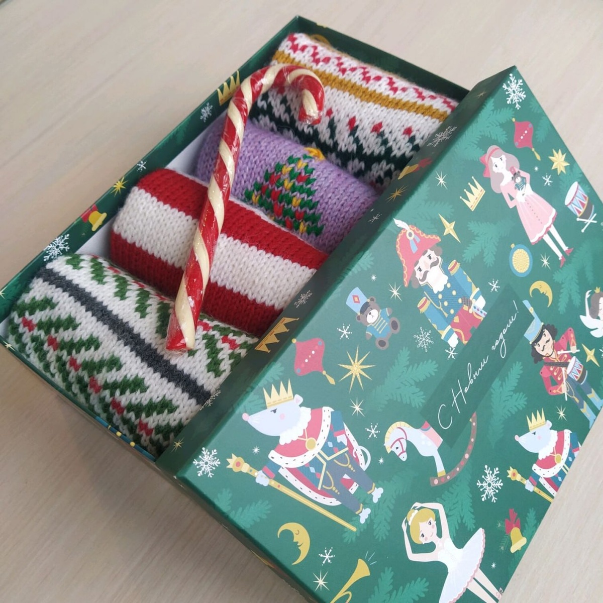 Большой новогодний подарочный набор вязаных носков RussianSocks ручной работы В этот замечательный набор входят четыре пары носочков: пушистые лавандовые с елочкой, полосатые красно-белые, похожие на новогодний леденец-тросточку и две пары носочков с еловыми веточками. Размер 37-40 Состав пряжи: шерсть, полушерсть и ангора Набор упакован в очень красивую новогоднюю коробку из плотного картона с крышкой со щелкунчиком и мышиным королем Размеры коробки 25*16*10см #вязаныеноски #новогоднийподарок