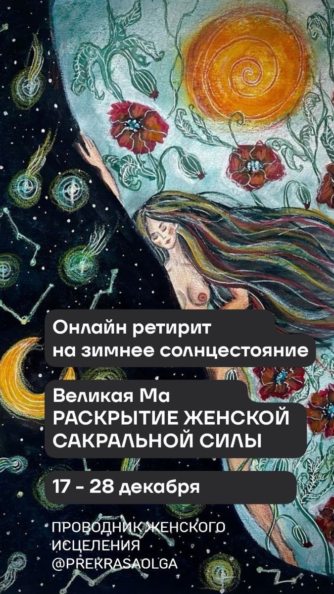 Уууух))) Намечается грандиозный шабаш!! Да-да)) Догадалась о чём я? 🔥ЗИМНЕЕЕ СОЛНЦНСТОЯНИЕ - это время, когда выстраивается мощный поток - закладка программы жизни на весь 2026 год 🔥 Сейчас очень мощно открываются знания. Просыпается память женщин рода. В каждой тебе спит огромная сила Великой Ма. Вспоминай родная! Зову тебя на онлайн ретирит ❤️ Великая Ма РАСКРЫТИЕ ЖЕНСКОЙ САКРАЛЬНОЙ СИЛЫ 17❤️28 декабря 💔 Я ДАМ КЛЮЧИ, чтобы ты сама ОТКРЫЛА СЕБЯ, СВОЮ ПРИРОДНУЮ СИЛУ На ретрите тебя ждёт ❤️🔥 вкусный микс: • ведические обряды солнцестояния • соединение 3-х потоков, молитва и дар женщины • женский шаманизм со священными растениями • даосские и тантра практики для наполнения сексуальной энергией • сакральные йони ритуалы ЭТО ПРО ЖЕНСКУЮ ИСЦЕЛЕННОСТЬ НА ВСЕХ УРОВНЯХ, И ОРГАЗМ ТОЖЕ!! ❤️ Стоимость участия 5.500 руб ❤️3.900 руб цена раннего бронирования !10 мест! ❤️8.800 руб тариф ГЛУБИНА Индивидуальное сопровождение и исцеление травмы под твой запрос. ❤️Всё будет происходить