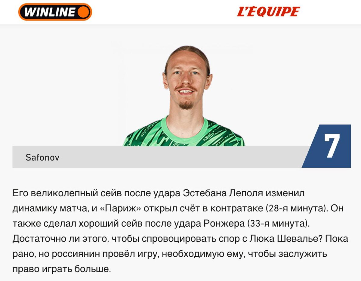 Сафонов получил оценку 7️⃣ от L’Équipe за игру с Ренном. Выше оценка только у Хвичи, который оформил дубль – 8️⃣