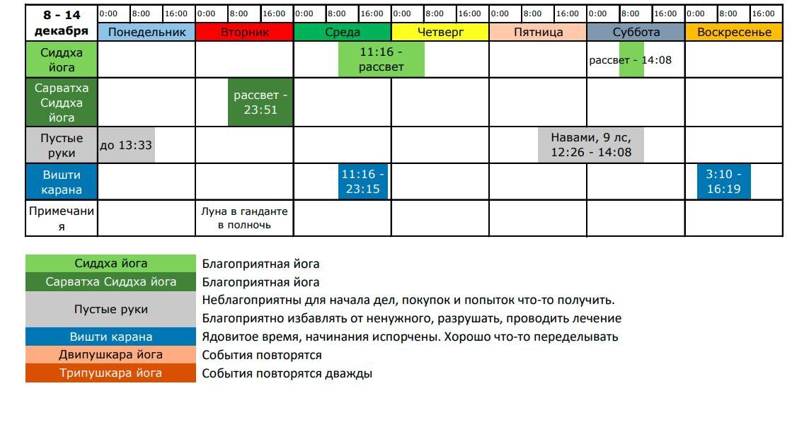 Неделя 8 - 14 декабря Часовой пояс GMT +3 (MSK) 🔸Неделя без переходов планет. И только Юпитер ретроградно возвращается по Близнецам. Вспоминаем что происходило в октябре. Что-то важное для себя мы должны понять в тех событиях. 🔸Завершающие 2 недели перед зимнем солнестоянием 22 декабря. Последние пол года нашим сознанием управляют асуры (демоны), на первый план выходят желания и страсти. С 22 декабря будут управлять Дэвы (Божества). Сейчас чем больше мы себя будем в чём-то ограничивать - в еде, удовольствиях и других желаниях, тем лучше. Рождественский пост в это время проходит не просто так. 🔹Понедельник - Луна в самой благоприятной накшатре Пушья (для всего, кроме свадеб). Только до 13:33 Пустые под управлением Ганеши - время для устранения препятствий. После - время более подходящее для созидания 🔹Вторник - день резкий, взвинченный, но можно сделать довольно много и весьма эффективно. Просто Луна в Ашлеше во вторник образует Сарватха Сиддха йогу. Более благоприятна первая пол
