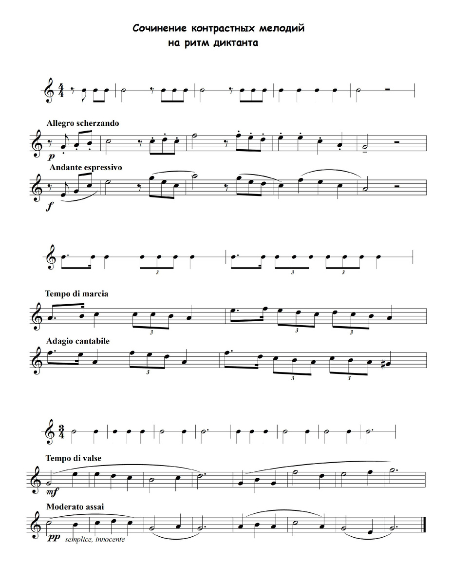 Предлагаем Вашему вниманию творческий способ работы с ритмическим диктантом. На записанный ритм можно предложить сочинить две максимально непохожие друг на друга мелодии – с контрастными темпами, жанрами, штрихами, а после сыграть или спеть их.