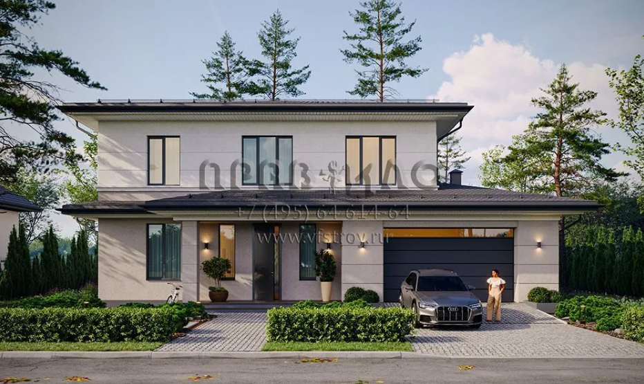 Проект большого двухэтажного дома с современной отделкой фасада декоративной штукатуркой светлых тонов, большим гаражом и вальмовой кровлей из фальцевых панелей. Отличительной особенностью планировочных решений является наличие кладовки с доступом из гаража, которую можно переоборудовать в мастерскую.
