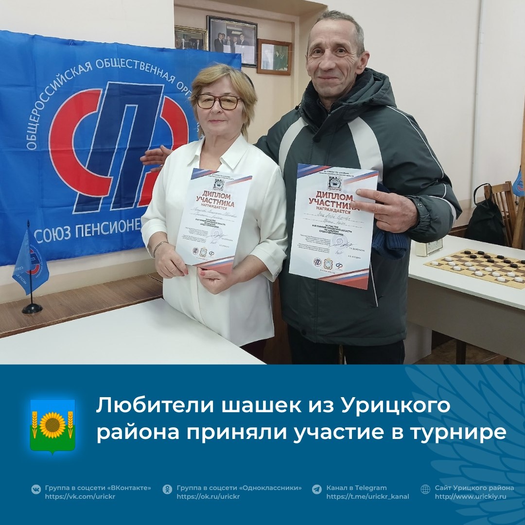♟В стенах БУ ДО ОО «Шахматно-шашечная спортивная школа» прошло соревнование, собравшее любителей шашек почтенного возраста – III турнир Орловской области для пенсионеров. Урицкий район на турнире представили два опытных игрока: Андрей Сергеевич Заиц и Валентина Ивановна Прокопова. Оба участника являются подопечными отделения социальной реабилитации и активного долголетия. Их сопровождала Елена Евгеньевна Хлабощина, специалист отделения. Турнир, несмотря на соревновательный настрой, прошел в теплой и дружественной атмосфере. 🏆По итогам состязаний Андрей Сергеевич и Валентина Ивановна были отмечены дипломами участников III турнира по шашкам, подтвердив свою преданность этой увлекательной игре. #УрицкийРайон #АдминистрацияУрицкогорайонаОрловскойобласти