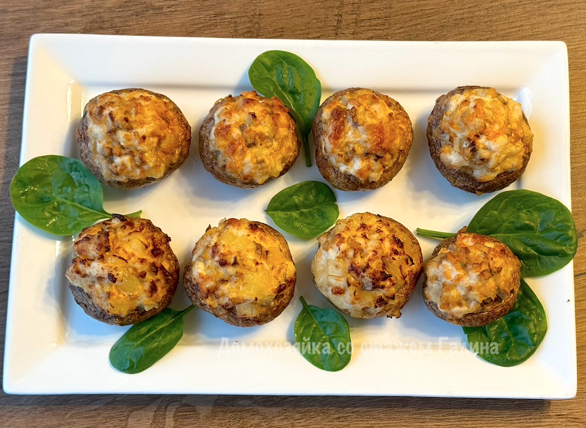 Для любителей необычных сочетаний вкусов предлагаю приготовить такое угощение к праздничному столу. Честно говоря, не уверена, можно ли сделать его заранее, но, думаю, можно. После того как начините грибы, сложите их в контейнер с плотной крышкой и заморозьте. Перед подачей, переложите в холодильник, дайте разморозиться, а затем запеките. Это выручит тех, кто работает, но хочет удивить гостей вкусными блюдами. Подавать лучше горячим, хотя и в охлаждённом виде получается отлично, проверено на себе! Итак, сначала я промыла грибы и удалила ножки. Шляпки отправила в аэрогриль при 200 °C на 10 минут (или в разогретую до 200 °C духовку на 15–20 минут), чтобы они слегка размягчились и отдали лишнюю влагу. Затем выложила их в миску, добавила около чайной ложки грибного соуса (или майонез), приправила специями для курицы и аккуратно обваляла. Ножки мелко нарезала. Смешала с нарезанной куриной грудкой, тёртым твёрдым сыром, специями для курицы, солью, перцем и заправила тем же соусом. Эт