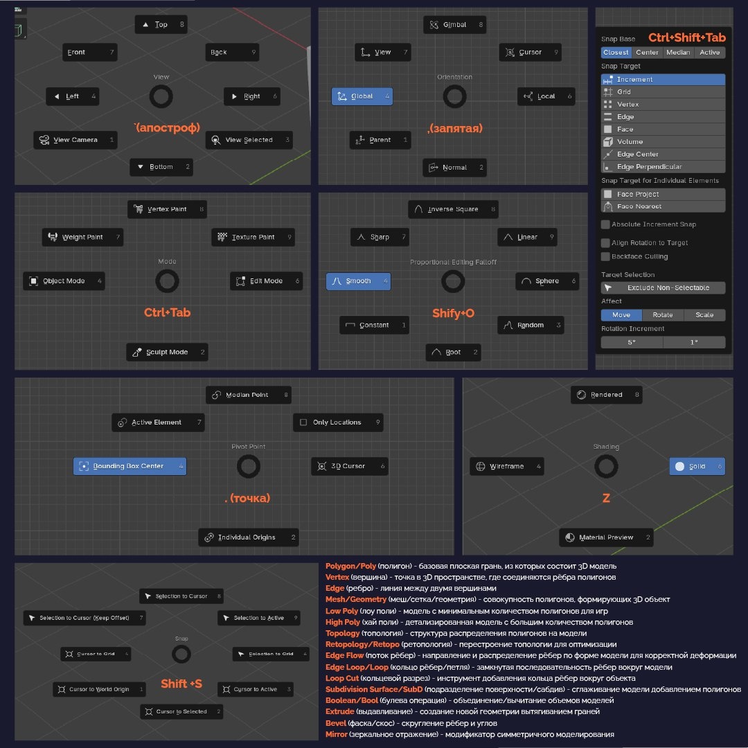 СТАНДАРТНЫЕ PIE-МЕНЮ В BLENDER: используй для ускорения работы Когда я только начинал в Blender, лазил по верхним меню мышкой как черепаха. Сейчас для ускорения вызываю команды через Pie-меню. Что это такое: Круговые меню, которые появляются прямо под курсором по хоткею. Не нужно тянуться в дальний угол экрана - нужные команды под рукой. Например: View (Вид) - клавиша ` Быстрое переключение между видами: Top, Front, Left, Right, Camera. Очень полезно, особенно для тех, кто работает с клавиатурами без NumPad. Orientations (Ориентация) - клавиша , Переключение системы координат. Нужно постоянно при моделировании, например, чтобы двигать объект по его собственным осям, а не по мировым, или перемещать части меша относительно нормалей. Snap (Привязка) Не Pie-меню, но тоже экономит время. Сама привязка включается на Shift+Tab, а настроить привязку можно в меню, вызвав его по Ctrl+Shift+Tab. Mode - Ctrl+Tab Позволяет быстро переключиться в нужный режим редактора, например в скульптинг (S