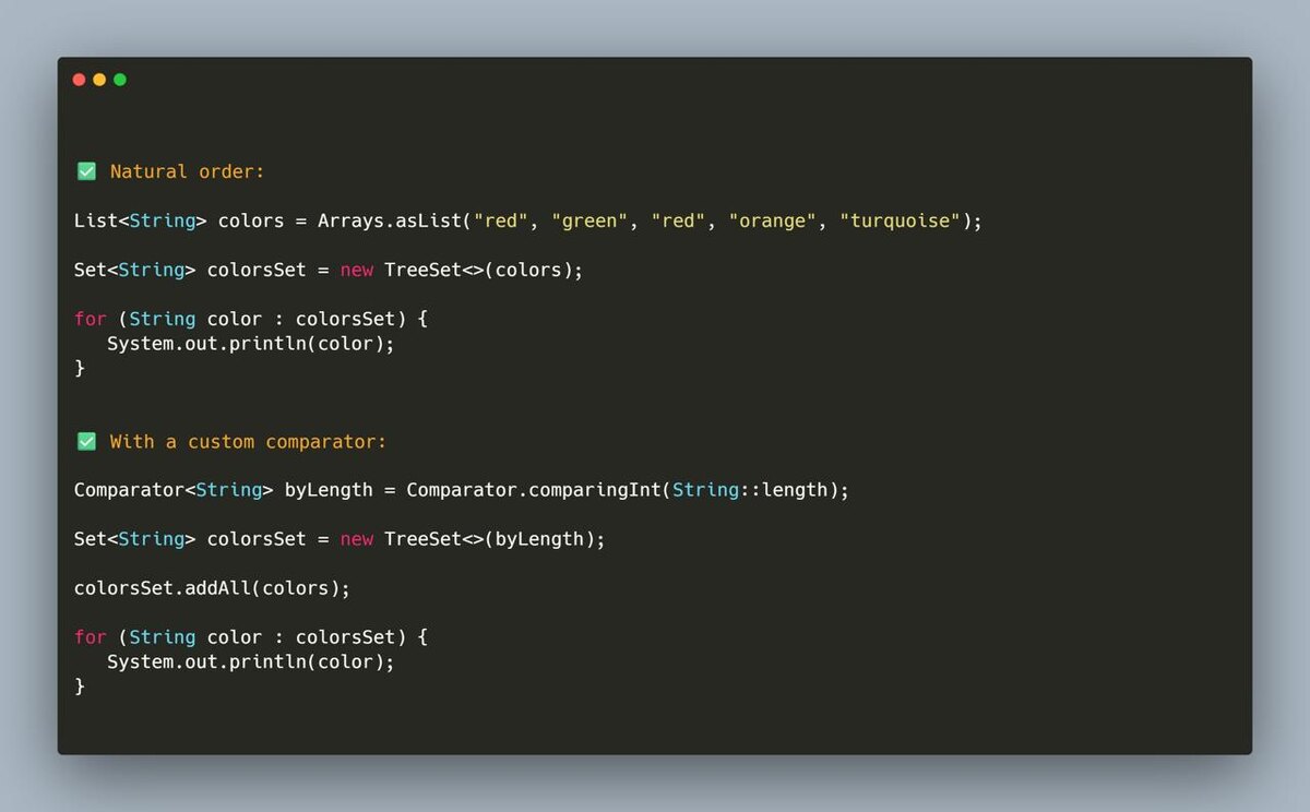 Java совет 💡 Нужно удалить дубликаты из списка и отсортировать элементы - по умолчанию или по своему правилу? Используй TreeSet. 👉 Вариант 1 — естественный порядок TreeSet сам уберёт дубли и отсортирует строки: List<String> colors = Arrays.asList("red", "green", "red", "orange", "turquoise"); Set<String> colorsSet = new TreeSet<>(colors); for (String color : colorsSet) { System.out.println(color); } 👉 Вариант 2 - кастомный компаратор Можно сортировать как угодно, например по длине строки: Comparator<String> byLength = Comparator.comparingInt(String::length); Set<String> colorsSet = new TreeSet<>(byLength); colorsSet.addAll(colors); for (String color : colorsSet) { System.out.println(color); } 🔹 TreeSet = автоматическое удаление дублей + сортировка по выбранному критерию. #Java #Collections @javarush