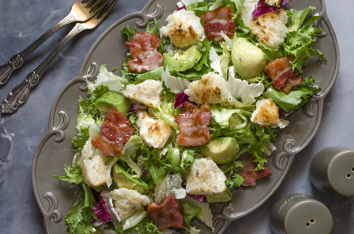 Если хочется приготовить что-то одновременно простое, сытное и эффектное, салат с сухариками, беконом и авокадо — идеальный выбор. Он сочетает в себе хруст, кремовую нежность и насыщенный мясной аромат, будто создан для тех случаев, когда нужно быстро собрать красивое блюдо, не жертвуя вкусом. Такой салат одинаково хорошо смотрится и на праздничном столе, и в роли плотного перекуса на каждый день. Ингредиенты: Авокадо — 1 шт. Бекон — 120–150 г Помидоры черри — 8–10 шт. Листья салата (айсберг, романо или микс) — 1 пучок Сухарики — 1 горсть (домашние или покупные) Сыр твёрдый или пармезан — 40–50 г Оливковое масло — 1–2 ст. л. Лимонный сок — 1 ч. л. Соль, перец — по вкусу Для заправки: Оливковое масло — 2 ст. л. Горчица — 1 ч. л. Чеснок — 1 зубчик Соевый соус — 1 ч. л. Мед — ½ ч. л. Как приготовить
