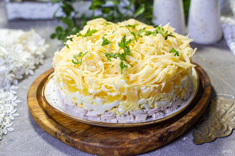 Салат «Невеста» — одно из тех блюд, которые неизменно ассоциируются с праздником, торжеством и особой атмосферой. Нежный, воздушный, почти кремовый по текстуре, он оправдывает своё романтичное название. Лёгкая рассыпчатость белков, мягкость курицы и бархатистость сыра создают удивительно гармоничное сочетание, которое делает салат любимцем многих семей. Этот вариант идеально подходит для новогоднего стола, юбилеев и любых случаев, когда хочется удивить гостей, не перегружая блюдо экзотическими ингредиентами. Простота состава делает салат доступным, а его внешний вид — по-настоящему праздничным. Ингредиенты Куриное филе — 250–300 г Яйца куриные — 4 шт. Твёрдый сыр — 120–150 г Репчатый лук — 1 шт. Майонез — 120–150 г Масло сливочное (замороженное) — 20–30 г Соль — по вкусу Перец — по желанию Пошаговое приготовление 1. Подготовка курицы