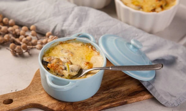Жюльен из мидий — эффектное, ароматное и необычное блюдо, которое станет украшением праздничного стола. В отличие от классических вариантов с курицей или грибами, этот жюльен обладает ярким морским вкусом, тонким ароматом сливок и приятной легкостью. Нежные мидии отлично сочетаются с сыром, луком и сливочным соусом, создавая богатую и в то же время изысканную текстуру. Жюльен можно готовить в кокотницах, тарталетках или небольших порционных формочках — в любом виде он выглядит презентабельно и подается удобно для гостей. Ингредиенты Мидии очищенные — 300 г Лук репчатый — 1 шт. Сливки 20–25% — 200 мл Мука — 1 ст. л. Твёрдый сыр — 120–150 г Масло сливочное — 30 г Масло растительное — 1 ст. л. Соль, перец — по вкусу Лимонный сок — 1 ч. л. Паприка или мускатный орех — по желанию Пошаговый рецепт