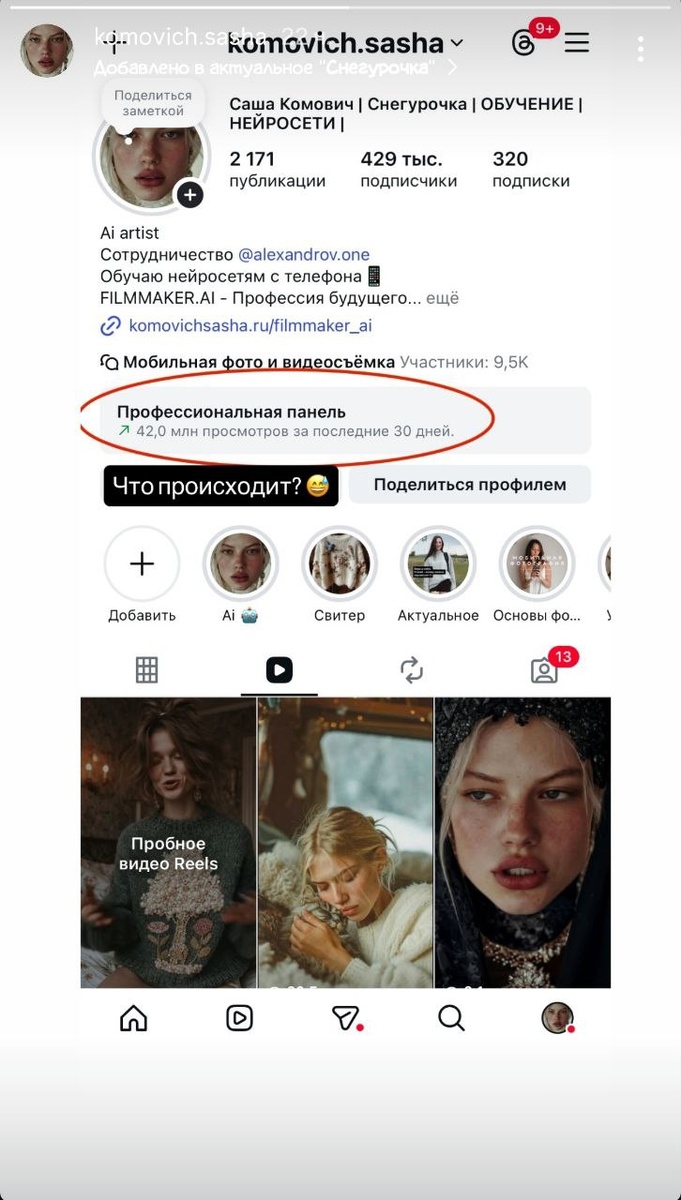 Продолжаю наблюдать за феноменом Саши Комович, создателя ИИ ролика "Расскажи, Снегурочка". Это история, как совершенно случайно человек проснулся довольно богатым. Саша Комович переехали из Улан-Удэ 5 лет назад на чёрное море и зарабатывала с мужем обучением фотографии. Не так давно (судя по Инстаграм) увлеклась ИИ, записала курс с двумя тарифами за 8900 и 15900 рублей. Как-то его продавала. Но потом последовала Снегурочка, на данный момент получившая 42 млн просмотров только на аккаунте Саши, думаю ещё столько же суммарно на других аккаунтах. Сам аккаунт Саши сделан довольно правильно, в описании ссылка на сайт, где продаётся обучающий курс, куда включены даже рассрочки. А теперь, внимание, цифры воронки на данный момент (07.12), основаны на её же информации по просмотрам и подписчикам. Остальные конверсии взяты пальцем в небо, скорее всего они могут значительно быть выше, т.к. профессия на хайпе. И многие хотят "точно также": 1. 42млн просмотров 2. 469К подписчиков (примерно 1+