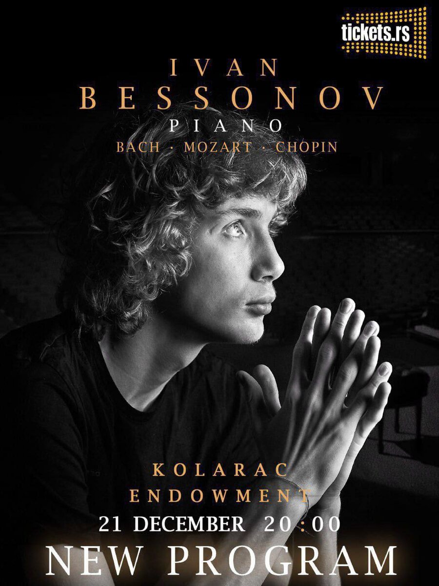 Пианист Иван Бессонов вновь выступит в Сербии Среди достижений пианиста — многочисленные награды международных музыкальных конкурсов, победа на «Классическом Евровидении, сотрудничество с ведущими оркестрами и дирижерами, участие в большом количестве фестивалей. Также он дает сольные концерты в лучших концертных залах по всему миру. На этот раз артист исполнит музыку выдающихся композиторов: Н. Метнер «Соната воспоминание», В. Моцарт «Соната N16 до мажор», И. Бах «Английская сюита N2», М. Равель «Сонатина фа диез минор», Ф. Шопен «Соната N3 си минор». 21 декабря, 20:00 Белград, KOLARAC Билеты: Polako Hedonist Ticket.rs