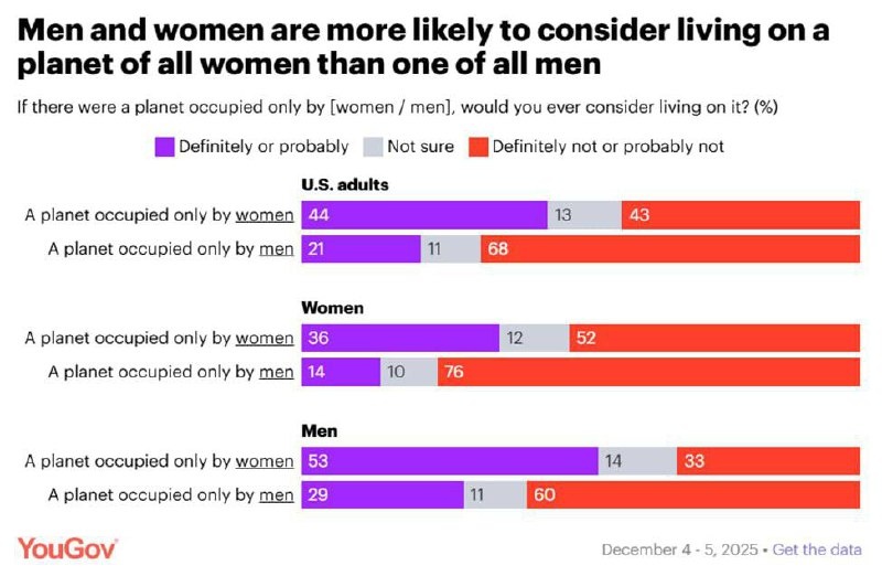 Всех с воскресеньем 🙌 Тут на глаза попался интересный опрос американцев: Опрашивали их о том, готовы, ли они проживать на планете, где только женщины или только мужчины И вот такие результаты: 36% женщин и 53% мужчин готовы рассмотреть вариант проживания на планете, населенной только женщинами. 14% женщин и 29% мужчин готовы рассмотреть вариант проживания на планете, населенной только мужчинами. В общем, и женщины, и мужчины хотят к женщинам. К мужчинам – не очень хотят 😀 Вам какой вариант ближе?