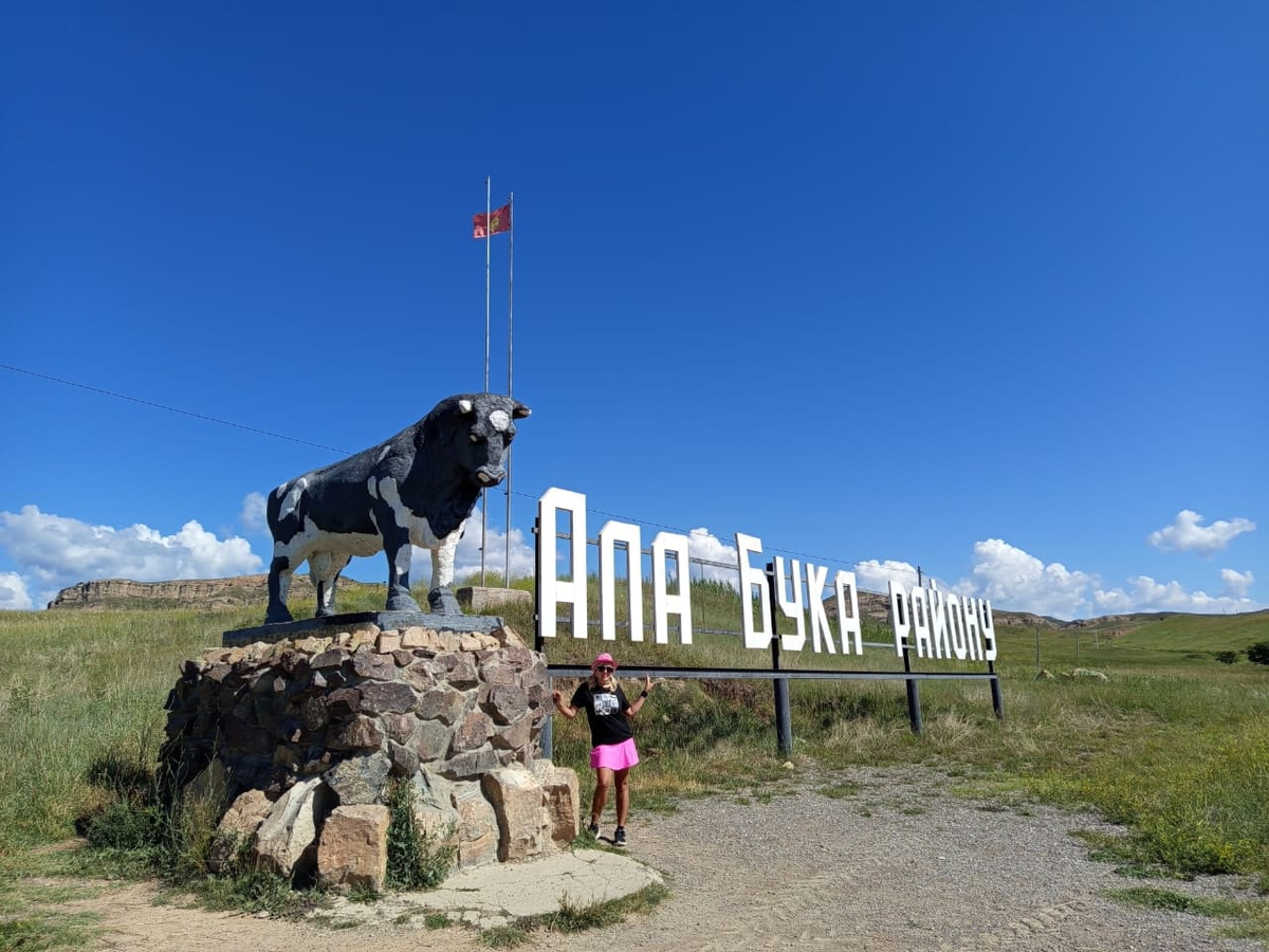 Утром 20 дня проснулись примерно в 20 км от крупного посёлка Ала-Бука, где в дальнейшем планировали остановиться на пару дней, чтобы сделать статью, хорошенько закупиться на дальнейший путь и постирать вещи. Не завтракав, отправились туда, предполагая, что в соседнем селе найдется тандырная. Часть дороги вновь пролегала через границу с Узбекистаном, а потом был крупный въезной монумент "Ала-Букинский район" с мощным быком. Кстати, Ала-Бука переводится как "пятнистый бык". Затем начался затяжной участок ремонта дороги, который мы "пробегали" с максимальным ускорением, ну и лишь в 5 км от Ала-Буки в беседке около сельского магазинчика в тени деревьев нам удалось позавтракать. Не самсами и пирожками, как мы мечтали, а оставшейся с предыдущего дня колбаской, лепёшкой и мазиком.