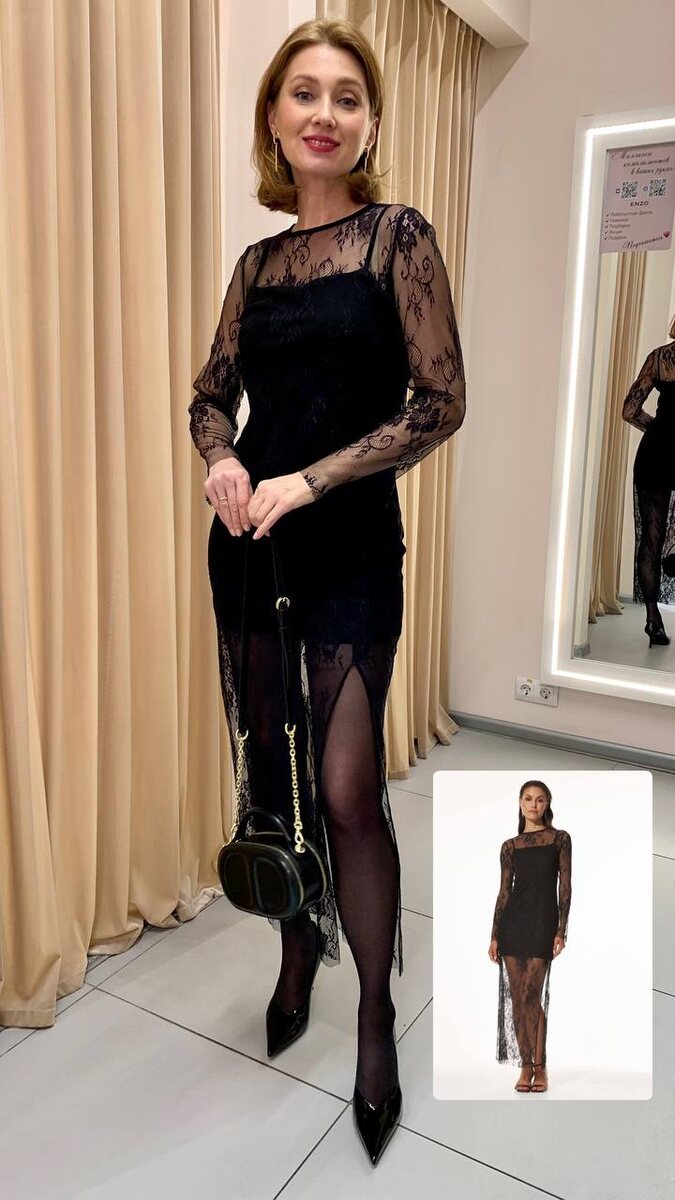 Стильные платья и лонгсливы из прозрачной сетки с кружевом Размеры в наличии: ⚫️Платье — 46,48; 6 015₽ (стоимость со скидкой 20%) ⚫️Лонгслив — 50,54; 1 795₽ (стоимость со скидкой 40%) Образы — стилист Юлия Бондарь💫