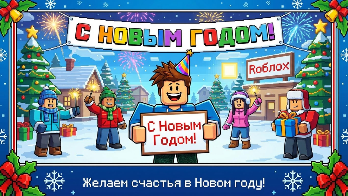 Яркие открытки в стиле "Roblox" на Новый год для ваших внуков! 🎄✨