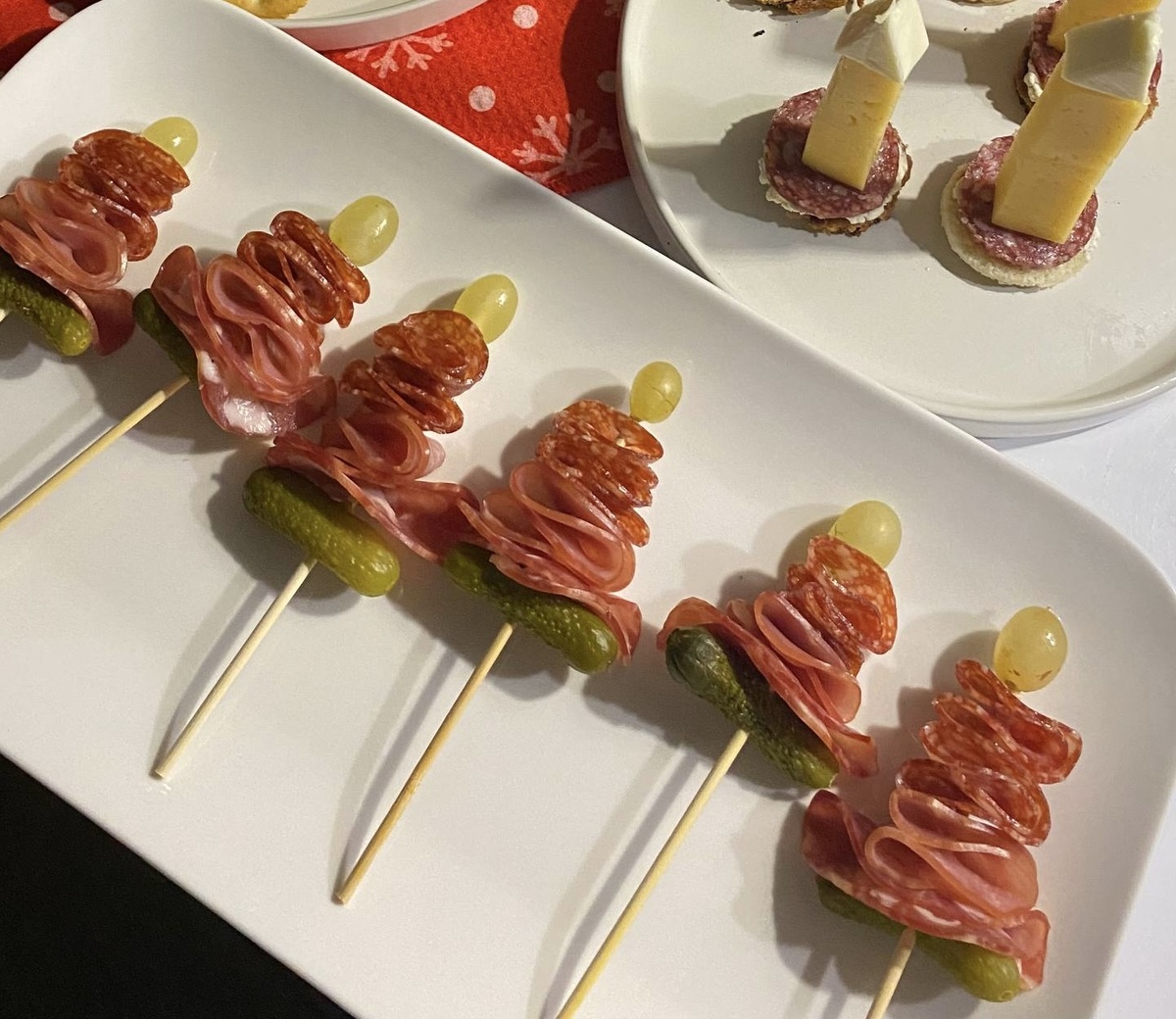 Новогодняя закуска «Елочка»: колбаса и огурец на шпажке Хотите удивить гостей простой, но эффектной закуской? Предлагаем вам попробовать сделать праздничные елочки из колбасы и огурцов. Эта закуска легко готовится и прекрасно украшает любой праздничный стол. Ингредиенты: - Колбаса сыровяленая – 40 г - Корнишоны свежие – 6 шт. - Оливки без косточек или виноградинки – 6 шт. - Деревянные шпажки – 6 шт. Пошаговая инструкция: 1. Подготовьте колбасу Нарежьте колбасу тонкими кольцами разного диаметра. Чем больше разнообразие размеров, тем интереснее получится композиция. 2. Создаем основу Нанижите на каждую шпажку сначала маленький кореньшон. Он станет основанием нашей миниатюрной ёлочки. 3. Формируем ствол Следующим этапом нанизываем колбасу, начиная с самого большого кольца. Каждое следующее кольцо должно быть меньше предыдущего. Если хотите добавить выразительности, можете свернуть каждое кольцо вдвое перед нанизыванием. 4. Украшаем верхушку Завершающим штрихом станут оливки или вино