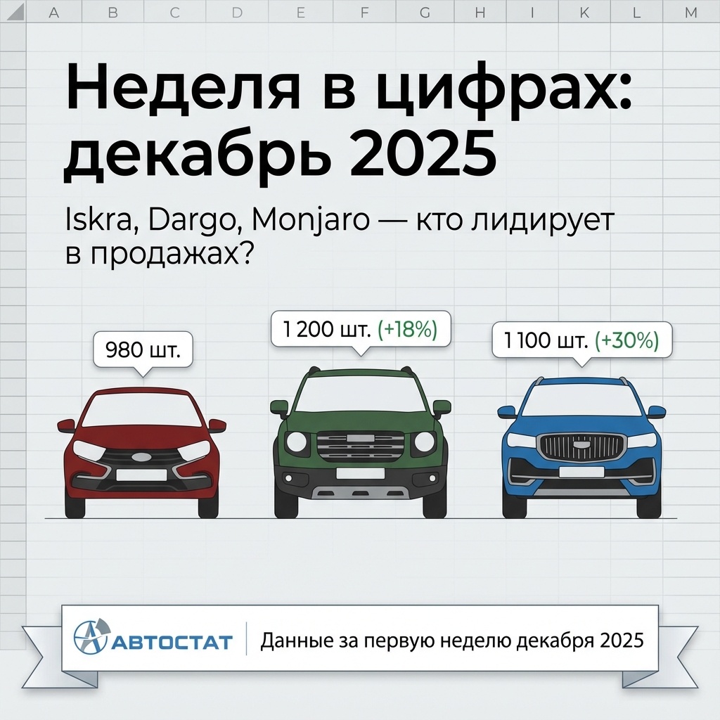 Первая неделя декабря стала рекордной для новинок: Lada Iskra стартовала с фурора, Haval Dargo набирает обороты, а Geely демонстрирует устойчивый рост. Вот главные цифры по данным АВТОСТАТ. Lada Iskra — старт продаж: 980 машин за неделю Первые продажи компактного кроссовера Lada Iskra начались 2 декабря 2025 года. За первую неделю реализовано 980 единиц по стартовой цене от 1 249 000 ₽. Высокий спрос объясняется сочетанием локальной сборки, гарантии 3 года и позиционированием в нише новых кроссоверов до 1,5 млн ₽ — сегменте, где конкуренция минимальна. По прогнозу АВТОСТАТ, к концу декабря объёмы превысят 3 000 проданных Iskra. Haval Dargo — уверенный рост: 1 200 шт. за неделю (+18% к ноябрю) Haval Dargo удерживает лидерство среди «внедорожных китайцев», продав 1 200 автомобилей за первую неделю декабря — на 18% больше, чем в ноябре. Ключевые факторы — реальный полный привод с режимом Off-Road, 7-летняя гарантия и цена от 2 149 000 ₽. Отмечается, что 65% продаж приходится на топовую