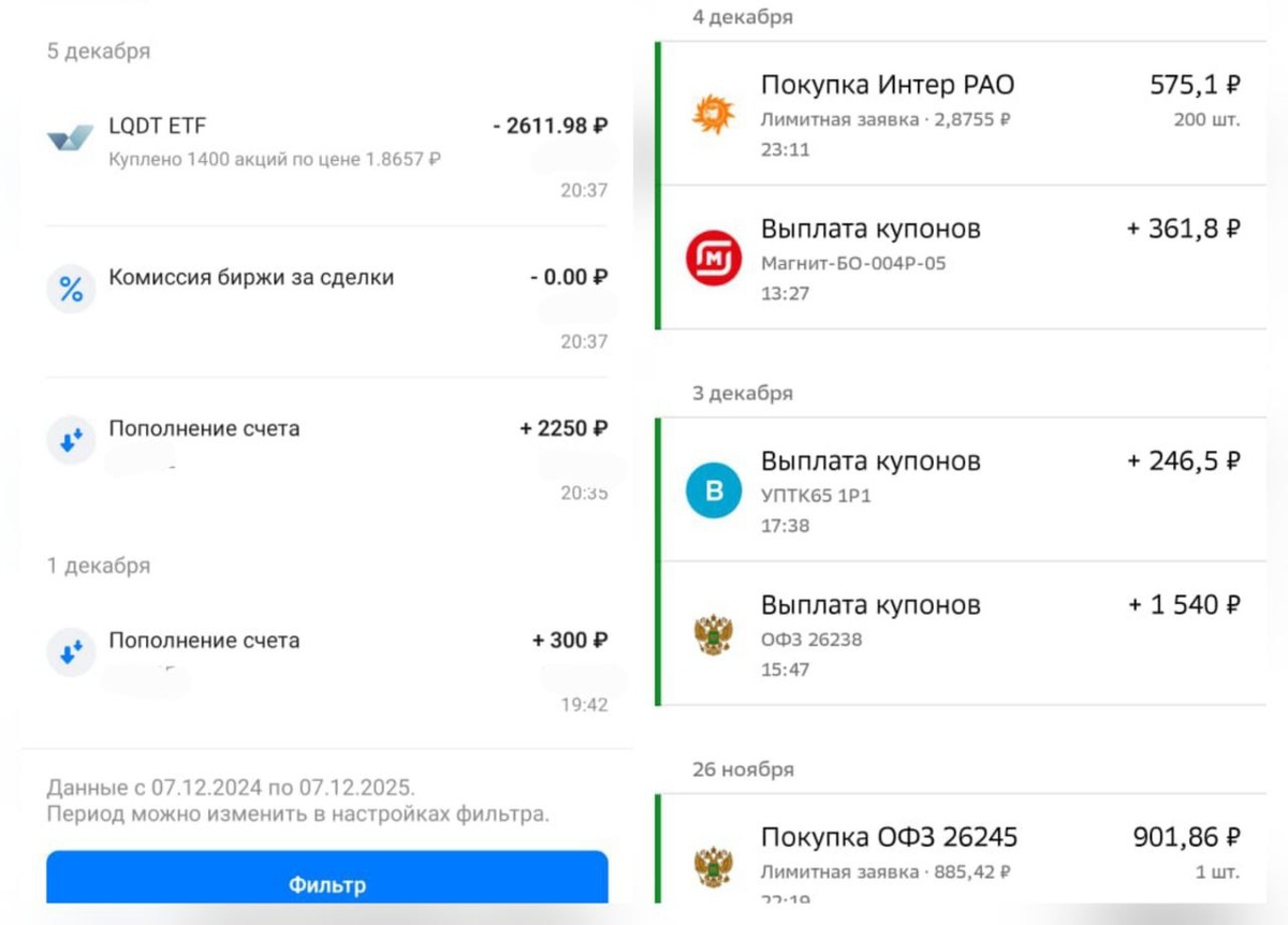 Подведем итоги недели с 1 по 7 декабря ✅Выплаты на фондовом рынке были от: - ОФЗ 26238 - 1540₽ за 50 облигаций, - УПТК-65 - 246,5₽ за 15 облигаций, - Магнит - 361,8₽ за 22 облигации, - Рентал ПРО - 617,8₽ за 70 паев, - VBIL - $4,48 за 28 паев. В сумме получилось 3101₽ по текущему курсу. 📌Покупки были минимальными – 2 лота ИнтерРАО на ИИС и немного фонда ликвидности на ВТБ. По другим направлениям: 📄ТПК Автопром своевременно выплатил ежемесячный платеж по займу. Денежный поток почти не изменился и составляет -3590₽.