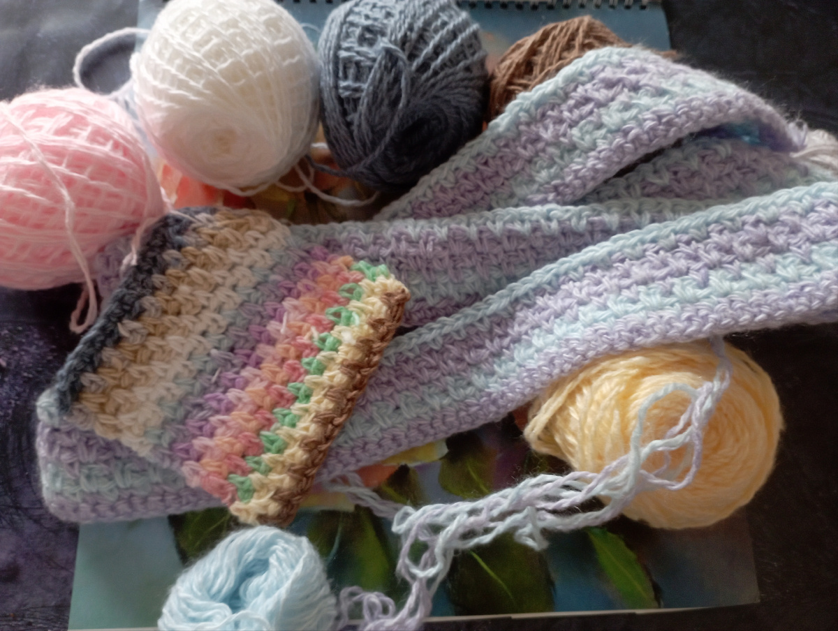Приветствую всех читающих ! С 1 декабря я решила вязать температурный плед . Не одна, конечно, в дружной компании. Каждый день нужно вязать всего по одному ряду той пряжей , цвет которой соответствует температуре воздуха за окном . Декабрь у нас, в Московской области , очень тёплый . Трава, мне кажется , снова пробивается из-под листвы, зеленеет вовсю. Туманы и сырость. Палитру цветов будущего пледа я определила. Подумала , какой цвет будет соответствовать температуре воздуха за окном. Записала . Первого декабря воздух прогрелся(!) до + 2 градусов . А этой температуре соответствует пряжа вот такого светло- сиреневого цвета. Значит, первый рад такой . Затем два дня было прохладнее, + 1. А это - нежно голубой цвет в моей палитре. Вот так получилось. Затем три дня+2,+2,+3, значит, опять сиреневый. А сегодня +1. Когда связала образец, взвесила, сделала расчеты, получалось, что плед нужной мне ширины и длины должен весить около трёх килограммов. Образец мне не показался тяжёлы