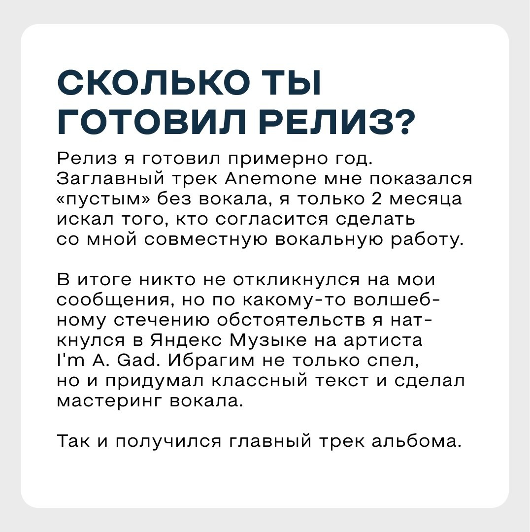 ↪ Школа Маскелиаде (07.12.2025 11:56) «Я устраиваю себе музыкальный детокс. После этого приходят новые идеи и музыка ощущается по-новому», — выпускник школы Ильхом Mokhlii (STRH music) рассказал о своем альбоме «Anemone». 🔹О чем альбом? В любой музыке слушатель найдет что-то свое и будет интерпретировать всё по-своему. Я бы сказал, что альбом «Anemone» — это саундтрек для промозглого вечера, когда дождь размывает огни витрин, а мысли уносят в прошлое. 🔹Что было самым сложным, вдохновляющим? Самым сложным оказалось найти вокалиста :) Я вдохновляюсь музыкантами, на которых хочу быть похожим. Наверное, в моих треках есть схожесть с Lane 8 и Ben Bohmer. Продолжение в карусели 👉🏻 Послушать альбом по ссылке #релизы #выпускники 🎥 Video by Школа Маскелиаде ➰ ВК