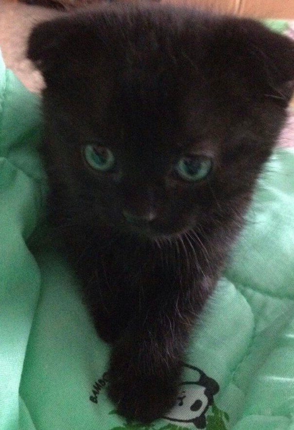 Это был не «дымок», не серый кот, о котором я мечтала. Перед нами сидел настоящий уголёк — крошечный, абсолютно чёрный комочек с большими глазами. Такой интересный, как домовёнок Кузя)
