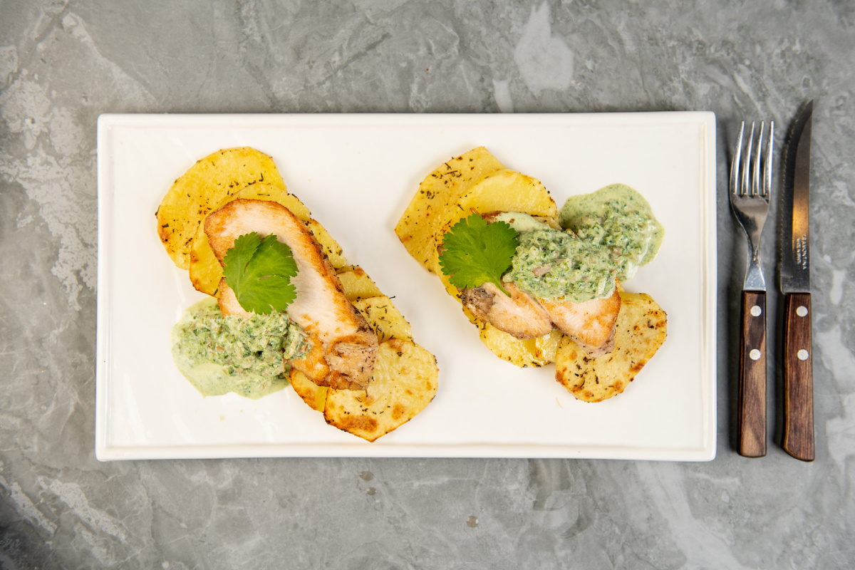 Куриная грудка су-вид с запеченным картофелем и сливочным соусом из шпината