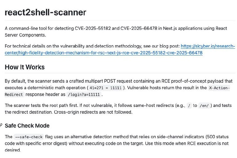 🔍📡 Инструмент для сканирования уязвимостей в Next.js приложениях react2shell-scanner помогает выявлять уязвимости CVE-2025-55182 и CVE-2025-66478 в приложениях на React Server Components. Он использует различные методы проверки, включая безопасный режим и обход WAF, чтобы обеспечить точное обнаружение без выполнения кода на целевых системах. 🚀Основные моменты: - Обнаружение уязвимостей в Next.js с помощью RCE PoC. - Поддержка безопасного режима проверки без выполнения кода. - Возможность обхода WAF для повышения эффективности сканирования. - Поддержка Windows и Unix-подобных систем. - Вывод результатов в формате JSON для дальнейшего анализа. 📌 GitHub: https://github.com/assetnote/react2shell-scanner #python