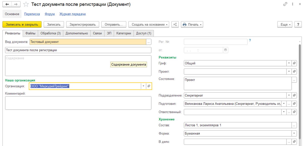 К примеру, в вашей организации входящую корреспонденцию регистрируют сразу при создании карточки документ, до момента запуска документа по маршруту обработки. Соответственно действие Регистрация вы не добавляли в маршрут документа, но после регистрации документ и реквизиты блокируются и доступны только для просмотра. Для примера я создал и записал документ. Далее регистрируем документ и он становится не доступен для внесения изменений. Поля становятся серыми и не кликабельными. Если у нас созданы НДПС (настройки доступности по состоянию), переходим в них и видим, что у нас есть этап "Проект" и далее уже по действиям из обработки. Этапа Регистрация или состояния Зарегистрирован у нас нет, но дело поправимо. Нам нужно создать в виде документа новые настройки маршрута обработки и добавить первым действием "Регистрацию". Правила обработки можно оставить прежние и не отмечать галочкой действие Регистрация. Далее открываем повторно НДПС по документу и видим, что у нас добавилось действи