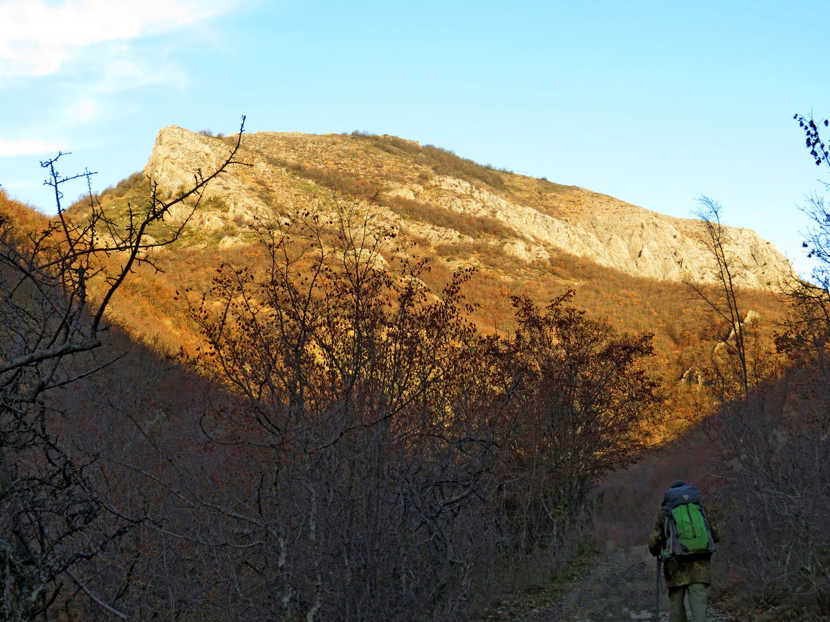 В просвет «ворот» видна эта удивительная гора. То ли она делает реверанс, то ли хочет взлететь в небо. Она и действительно расположена не так далеко от начала ущелья. Называется она – Тырме-Кая. Мне очень нравится это гора. Основная ее красота открывается, если пройти по ущелью дальше. Но сегодня мы хотим попробовать на нее подняться. Выбрав место подъема и перескочив через речушку, мы, к удивлению, обнаружили не то, что тропу, а дорогу! Неужели это еще одна из древних дорог! Я так увлеклась осмотром красот, открывающихся при подъеме, что дорога, скорее всего попала только на видео. А красоты открывались! Мы постепенно поднимались над ущельем. С одной стороны открывались скалы и горы противоположного борта ущелья. Есть на что засмотреться и запланировать другие маршруты. Одновременно впереди открывались другие ущелья. Казалось, что они бесконечны! Постепенно дорога превращалась в тропинку и пыталась нас завести по другую сторону горы. Вот сейчас еще немножко посмотрим и пойдем дальш
