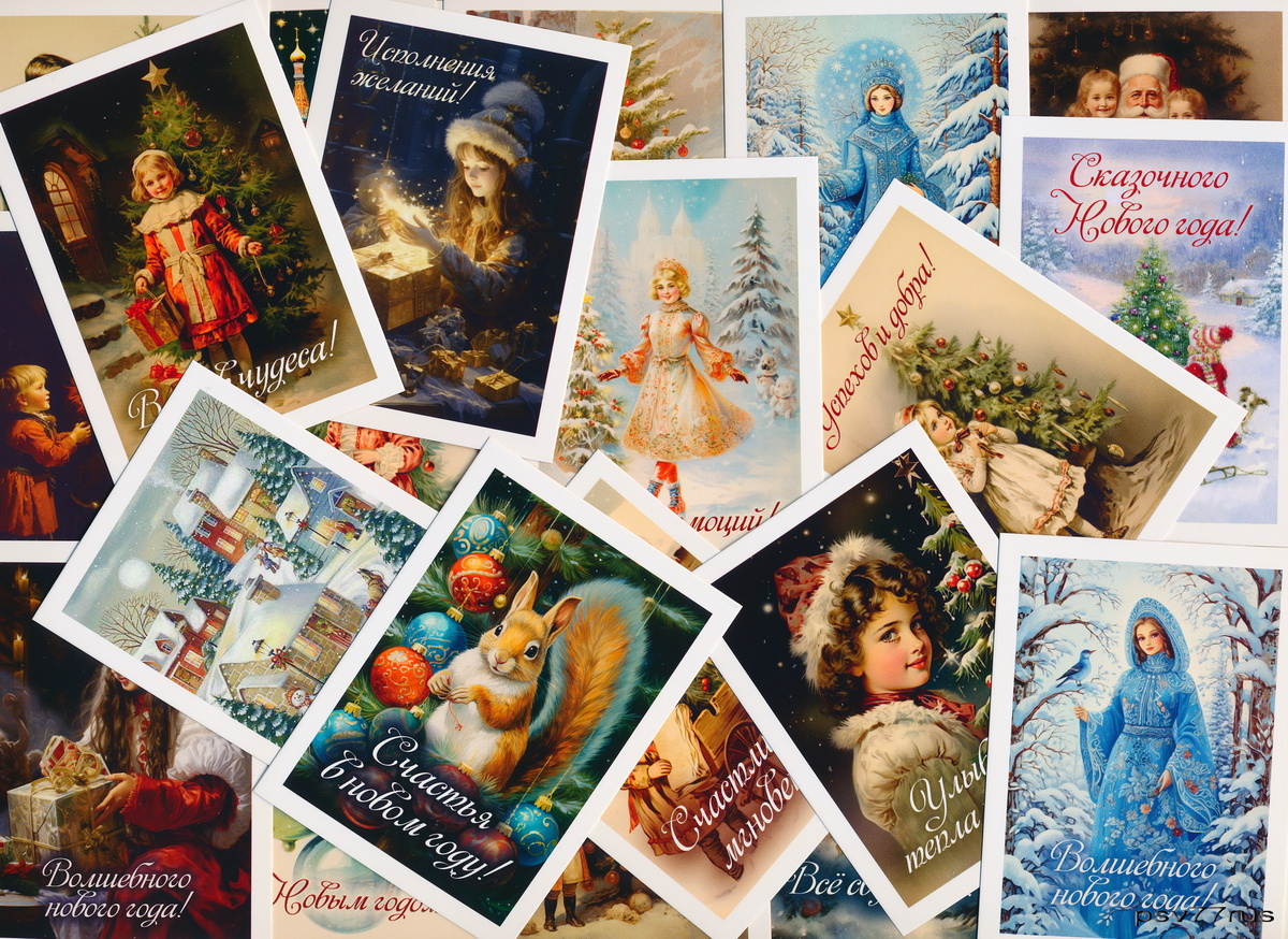 Карманные календарики - Новогодняя сказка на - 2026 год. (часть-1). Стиль - ретро с пожеланиями. Материал - мелованный картон. Размер - 100 x 70 мм. Плотность - 300 г/кв.м. Страна производства - Россия. Издатель - нет данных. Количество - 30 шт.