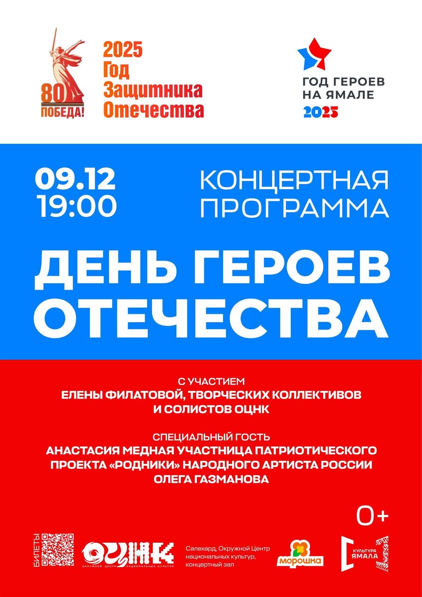 До концерта ко Дню Героев Отечества осталось 2 дня Дорогие друзья! Напоминаем, что уже во вторник, 9 декабря в 19:00, состоится концертная программа, посвященная Дню Героев Отечества. Вход бесплатный. Забронировать место можно по ссылке: clck.ru/3QYF7u #ОЦНК #Салехард #ГодЗащитникаОтечества