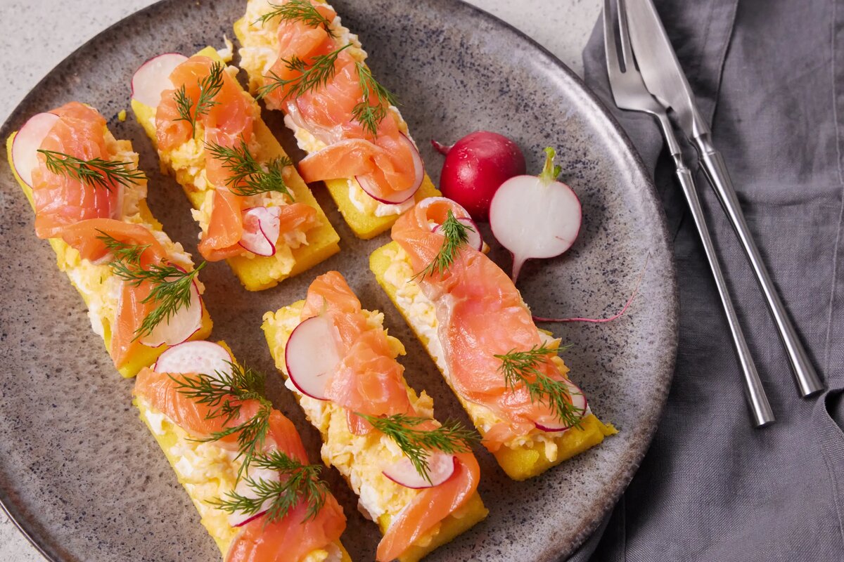 Ищете интересную идею для завтрака или фуршета? Попробуйте приготовить тосты из кукурузной поленты. Получается сытно, красиво и необычно. А рецепт мы подсмотрели у шеф-повара Александра Бельковича.