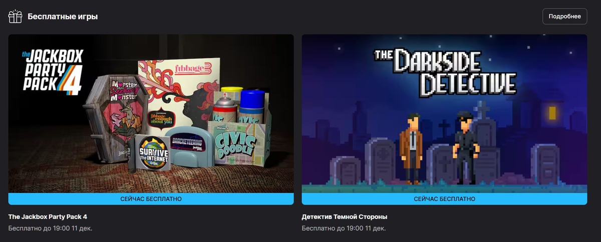 О, круто, в Epic Games Store оказывается прямо сейчас раздают Jackbox Party Pack 4. Самое то для новогодней ночи, если планируете встречать её с друзьями. Забираем. The Darkside Detective тоже выглядит прикольно. Напомнила Thimbleweed Park по скриншотам и описанию.