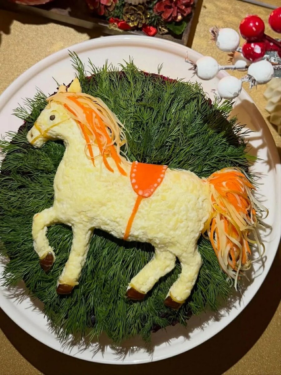 Больше рецептов в моем Телеграмм - канале https://t.me/vkysnolov Ингредиенты: • Куриное филе-300 гр • Твердый сыр-80 гр • Яйца-2 шт • Морковь-2 шт(средние) • Свекла-2 шт • Майонез по вкусу Соль по вкусу Приготовление: •Отварное филе нарежьте небольшими кубиками или разделите на волокна. • Свеклу отварите в кожуре до готовности.Натрите на крупной или средней терке. • Морковь отварите в кожуре до готовности.Натрите на крупной или средней терке. • Яйца сварите вкрутую, охладите и очистите. Также натрите на терке. • Сыр также натрите на крупной или средней терке. Этот салат очень красиво смотрится, если формировать его слоями. 1-й слой курица, смазать майонезом. 2-й слой тертый сыр,смазать майонезом. 3-й слой тертые яйца, смазать майонезом. 4-й слой морковь, смазать майонезом. 5-й слой свекла, смазать майонезом. Лошадку оформила натертым сыром и картошкой 🥰