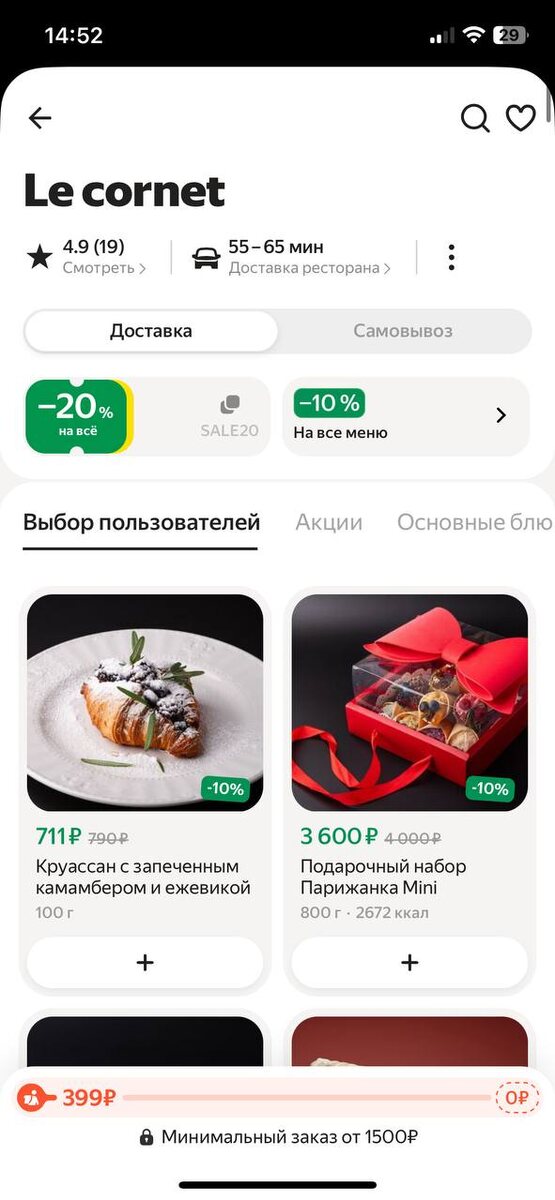 Блюда из Ле Корнет может попробовать в доставке в сервисе Яндекс -у кого нет времени посетить заведение лично
