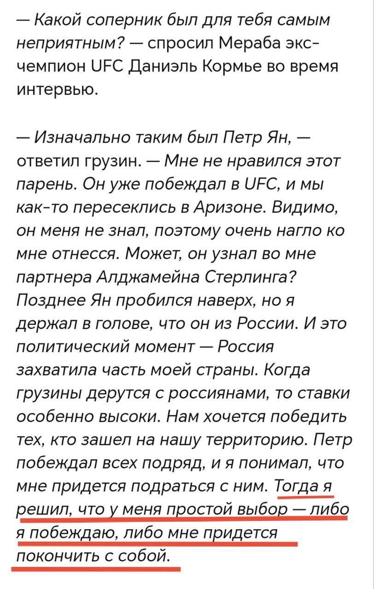 ПОЗДРАВЛЯЕМ ПЕТРА ЯНА! У меня есть друзья, кто занимается этим непростым видом борьбы (UFC). Я, когда позволяет график, хожу на соревнования. Это испытание! Очень мужская тема. Но вот Петра хочу поздравить лично, от всего сердца и вдвойне. Во-первых, с чистой победой и с российским флагом, с которым он ее праздновал. А во-вторых, его соперник - русофоб, Мераб Двалишвили. Он из тех "бойцов", кто любит попи...деть перед боем. "Всех русских нужно побеждать!" "Россия напала на его родину" и т.п. Прикольно напутствие тренера Петра перед финальным раундом: - Вперед! Дай им всем п...ды! Всё получилось в лучшем виде. А в своем интервью перед боем Двалишвили козырял, что: "... У меня простой выбор. Либо я побеждаю, либо мне придется покончить с собой." Ну что же, ждем мужского поступка. Грузин ведь слоао держит, не так ли?