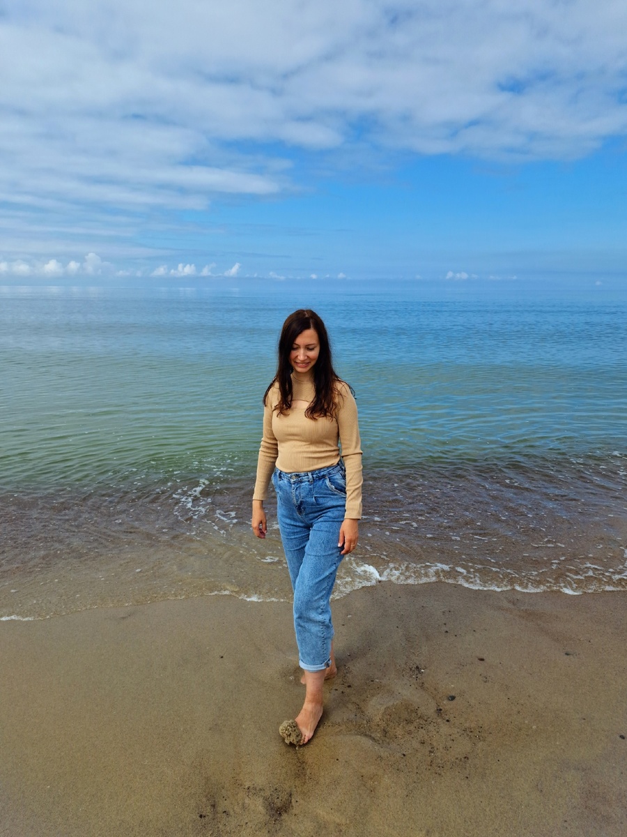 Идти по дороге было скучновато. Море манило. 😍 И мы спустились на берег где-то на середине пути. Там люди уже ходили, и мы тоже пошли. Пошли прямо по краю воды. Вода была не холодная и не тёплая. Очень освежала наши уставшие ноги, покрывшиеся мозолями к концу нашего путешествия. 😀 Это, кстати, очень помогло.Мне кажется, мои ступни после прогулки по солёной прохладной воде даже стали на размер меньше 😀