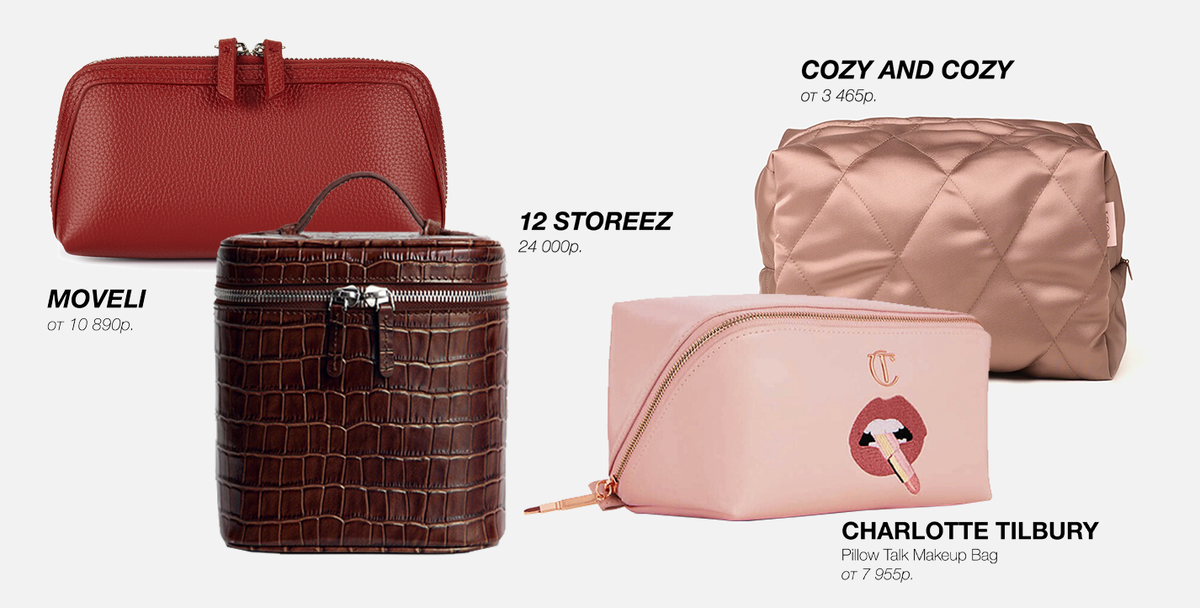 Обращаем внимание на Moveli (у них можно нанести инициалы!), на шелковые в оттенках на выбор от Cozy and Cozy и шоколадный крокодиловый кейс от 12 Storeez. Отдельное внимание на косметичку от CHARLOTTE TILBURY — выбор соосновательницы Speechless, Марии
