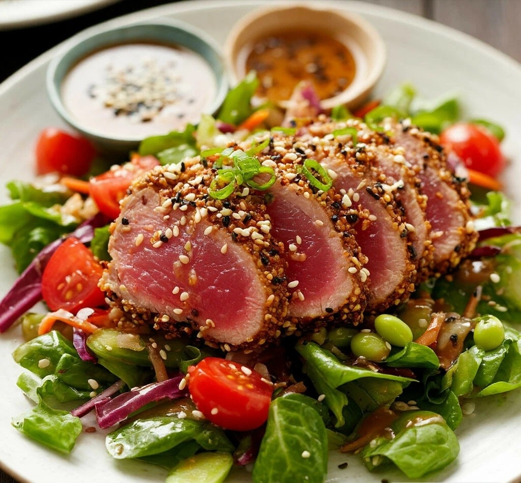 ГОРЯЧЕЕ — СТЕЙК ИЗ ТУНЦА В КУНЖУТНОЙ КОРОЧКЕ С СОУСОМ ИЗ МИСО Мяу, мои ценители ресторанного шика дома! 😺🎩 Хотите почувствовать себя шеф-поваром? Этот стейк — ваш выход! Сочнейший тунец в хрустящей кунжутной «шубке», нежная, почти сырая серединка и пикантный азиатский соус... Готовится за 5 минут, а впечатление производит — на всю жизнь! Это кулинарная магия! 🐟✨ СТЕЙК ИЗ ТУНЦА В КУНЖУТНОЙ КОРОЧКЕ С СОУСОМ ИЗ МИСО ИНГРЕДИЕНТЫ (на 1 порцию): 🧾 ·Стейк тунца (кусок филе, 3-4 см толщиной) – 150-180 г 🐟 ·Кунжут белый и чёрный – по 1 ст.л. ⚫⚪ ·Масло растительное – 1 ст.л. ·Для соуса: паста мисо – 1 ч.л., мёд – 1 ч.л., горячая вода – 1 ст.л., сок ½ лайма, соевый соус – ½ ч.л. 🍯🍋 ·Для подачи: пучок микрозелени или рукколы. 🥬 ВРЕМЯ ПРИГОТОВЛЕНИЯ: ⏰ 10 минут СЛОЖНОСТЬ:🐾 Нужна внимательность (не пережарить!) ПОШАГОВЫЙ РЕЦЕПТ: 👩🍳 1. Стейк тунца промокнуть бумажным полотенцем. На тарелке смешать кунжут. Обвалять стейк со всех сторон в кунжуте, слегка придавливая. ⚫🐟⚪ 2. Приготовит