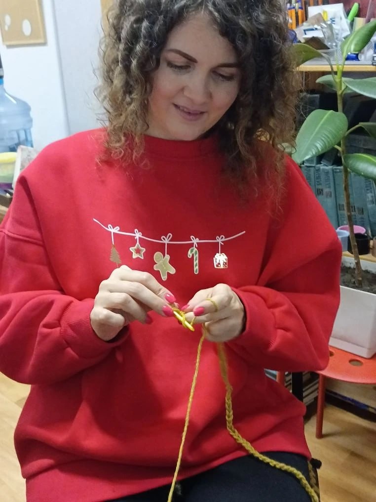 Учится вязать воздушные петли, пока я делаю презу для выступления в универе 🤓