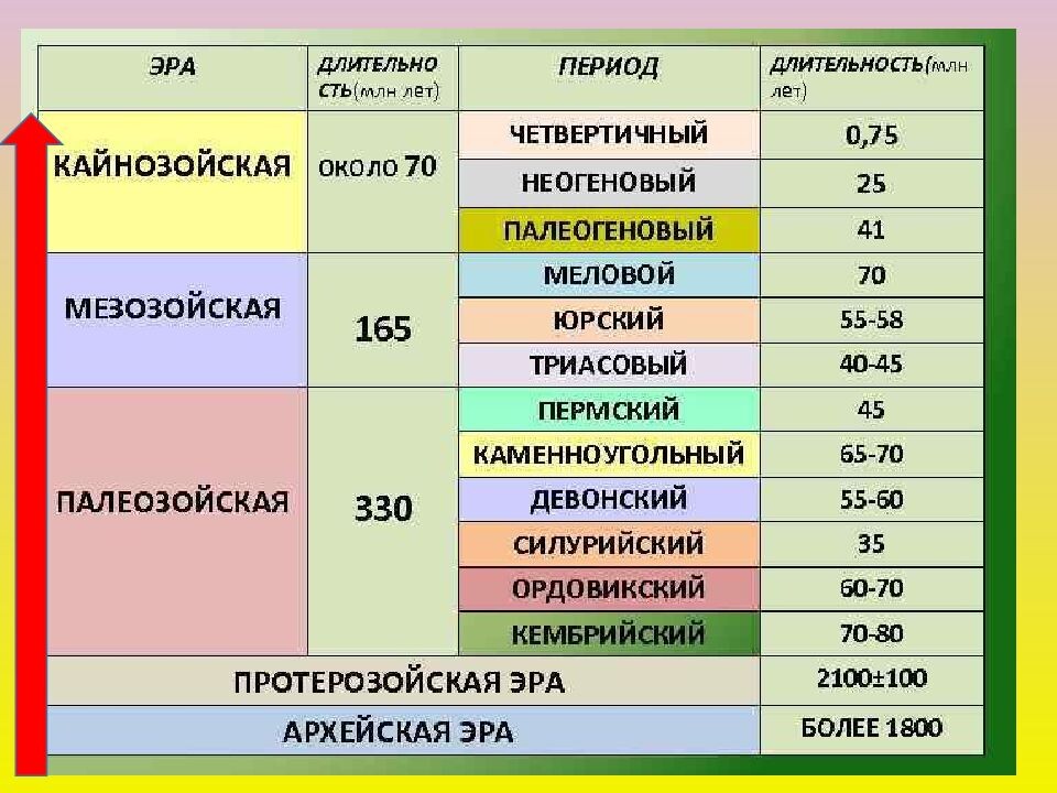 Все периоды истории Земли по порядку (на основе геохронологической шкалы): Архейская эра (3,5–1,9 млрд лет назад). Протерозойская эра (1,9 млрд–570 млн лет назад). Палеозойская эра (570 млн–225 млн лет назад). Включает следующие периоды:Кембрийский (570 млн–480 млн лет назад);
