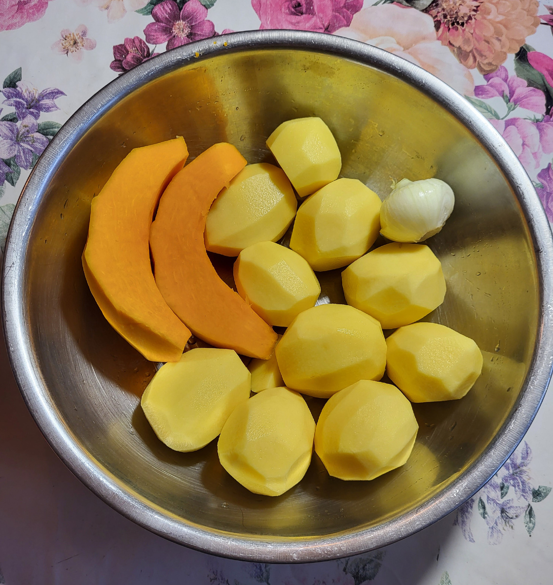 Сегодня поделюсь рецептом ОСОБЕННОГО картофельного пюре. Такое пюре подойдёт и сторонникам правильного питания, и детям и пожилым людям. Секрет в тыкве, именно она содержит много клетчатки, витамин А, Е, витамины группы В, калий и магний, железо. Нам потребуется : 1кг картофеля (в очищенном виде) 300гр тыквы (в очищенном виде) 1 небольшая луковка Сливочное масло 30-50гр Молоко 100мл Соль Процесс приготовления : Картофель, лук, тыкву очистить от кожуры, из тыквы убрать семена. Картофель разрезать пополам, лук порезать кубиком, тыкву на небольшие кусочки. Картофель залить тёплой водой и поставить на плиту на сильный огонь, когда закипит убавить нагрев, по надобности снять пену и продолжить варить. Через 10 минут добавить к картофелю тыкву, лук, соль и варить до готовности приблизительно еще 15 мин. Тыква варится быстрее, поэтому добавляем её попозже. Чтобы сохранить блюдо наиболее полезным, не нужно наливать много воды, только чтобы она чуть-чуть прикрывала овощи в кастрюле