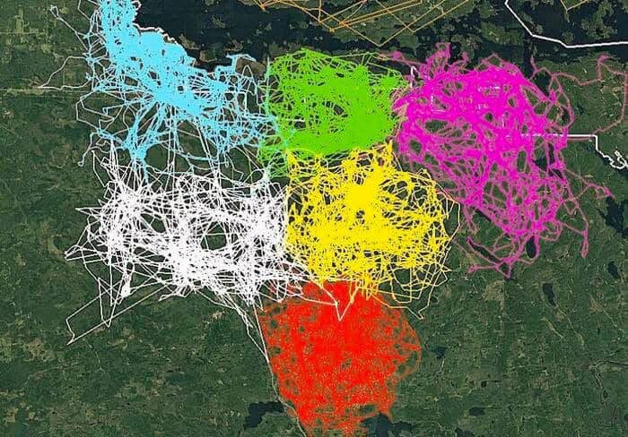 Парк Voyageurs National Park, Миннесота С помощью GPS–трекинга особей шести различных волчьих стай наглядно видно, насколько эти стаи избегают друг друга