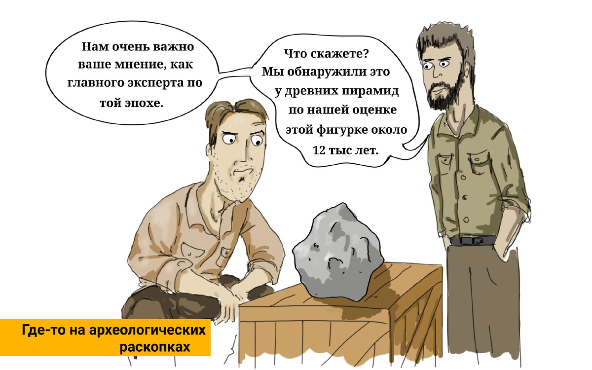Исследователи 5 лет смотрели на камень и пытались расшифровать, что же изображено в маленькой статуэтке, какой сюжет заложил творец в фигурку?? И в итоге вот это?!) Ну не прикол?! На этом фоне моя версия совсем даже не бредовая, а я на нее потратил всего-то пару дней) Если интересно то загуглите новость, там довольно интересно но в итоге ученые оставляют с ощущением как после ток шоу, где в конце все ровно ничего не понятно, у каждого куча версий добавляя фразу ;- А может и не так все было.