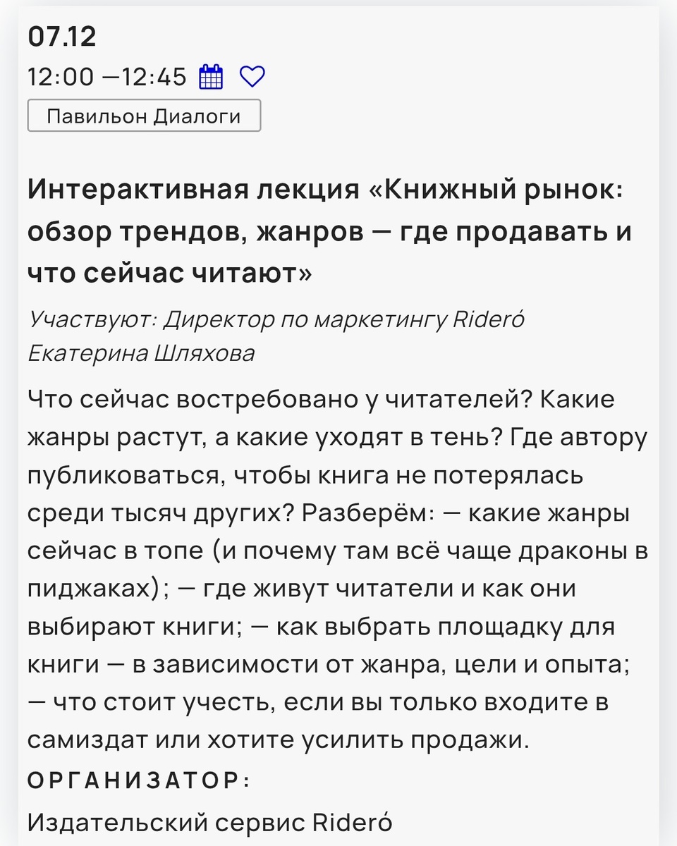 Я посетила два с половиной выступления на темы писательской кухни. В этой публикации я постараюсь сделать синтез услышанного, потому что это реально интересно и может быть полезно многим. Все эти выступления проходили в павильоне Диалоги под эгидой Ридеро. Вот эту лекцию я застала не полностью: 1. Обзор книжного рынка от Ридеро Несколько интересных слайдов: В конце прозвучала цитата, которая в принципе все резюмировала: Ваша книга - это как ребенок: вы можете его родить, но любить его другие люди не обязаны; чтобы его полюбили, вы должны приложить усилия. Среди задававших вопросы была девушка, которая пожаловалась, что пишет неканоничное тёмное фентези без любовной линии которое никто не хочет читать. Мне стало любопытно, как это реализовано, но я не успела взять контакт 😅Так что, если вдруг автор неканоничного тёмного фентези каким-то чудом увидит мою статью, прошу ссылку на книгу 😊 Вот на эту лекцию я пришла целенаправленно: 2. Взгляд блогеров и критиков на самиздат Участники