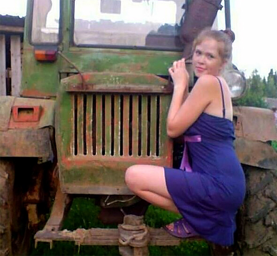- мини‑юбка и сложные позы на тракторе;
