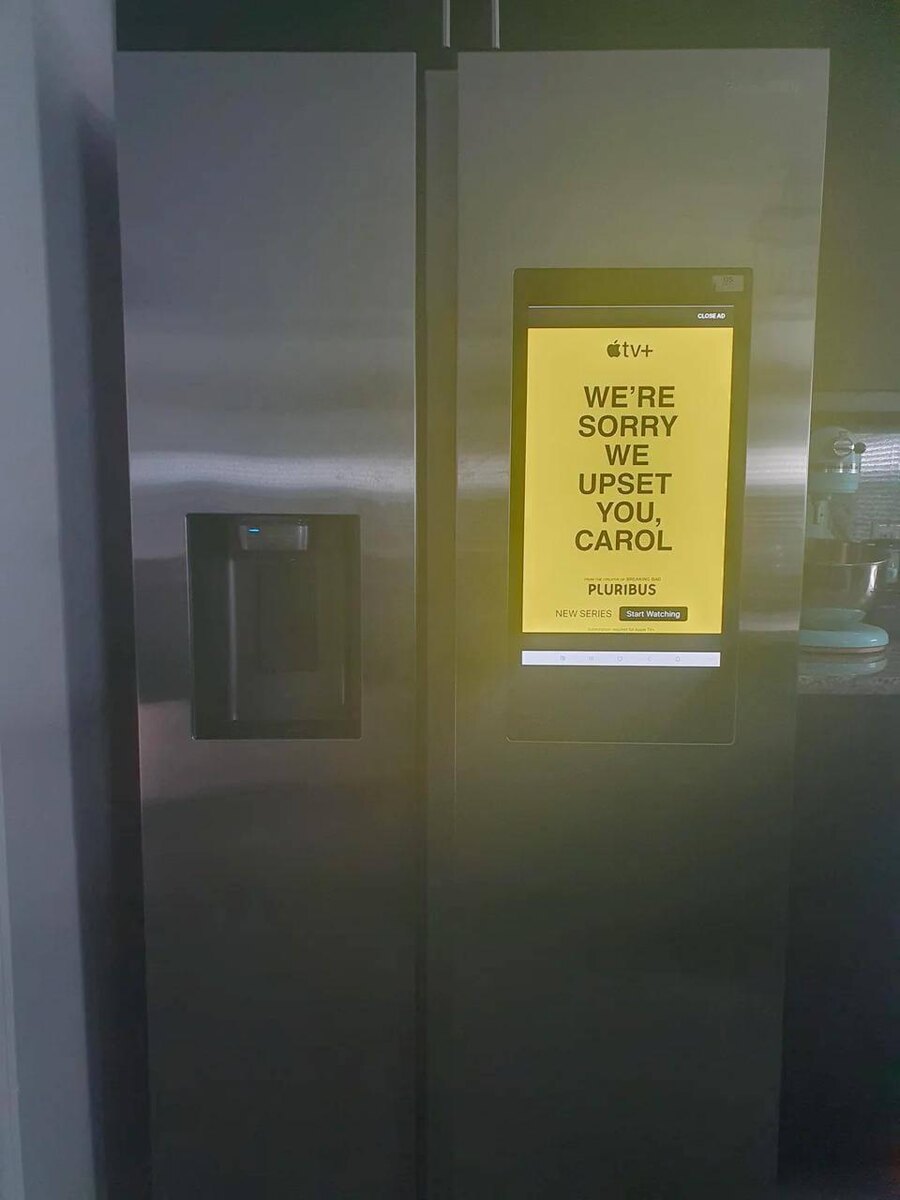 Реклама на умном холодильнике Samsung довела девушку из Великобритании до нервного срыва. Недавно компания начала показывать рекламу на экранах премиальных холодильников. Одной из первых стала реклама сериала «Из многих» от Apple со слоганом: «Нам жаль тебя расстраивать, Кэрол» (на фото). Рекламу увидела настоящая девушка Кэрол, страдающая шизофренией. Она решила, что за ней следят и кто-то пытается связаться с ней через холодильник. Это спровоцировало острый приступ болезни, после которого ей пришлось лечь в больницу. Теперь родственники пострадавшей выясняют, можно ли кого-то засудить за рекламу в собственном холодильнике.
